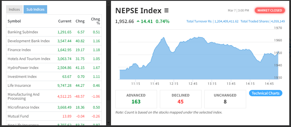 आज ४५ वटा कम्पनीको शेयर मूल्यमा गिरावट आउदा १६३ वटा कम्पनीको शेयर मूल्यमा सुधार देखिन्छ । सर्वाधिक धेरै साल्ट ट्रेडिङ कम्पनीको १२ करोड ७ लाख रुपैयाँको खरिद बिक्री भएको छ ।