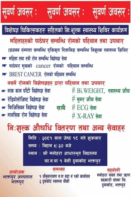 विशेषज्ञ चिकित्सकहरूसहितको निःशुल्क स्वास्थ्य शिविर आगामी जेठ १८ गते शुक्रवारका दिन बिहान ९ः३० बजेदेखि आयोजना हुने आयोजकले जानकारी दिएको छन् ।