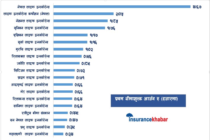 ६ महिनाको अवधिमा सबैभन्दा धेरै प्रथम बीमाशुल्क आर्जन गर्न कम्पनी नेपाल लाइफ इन्स्योरेन्स रहेको छ । कम्पनीले मंसिर मसान्तसम्ममा ४ अर्ब ६७ करोड रुपैयाँ प्रथम बीमाशुल्क आर्जन गर्न सफल भएको छ ।