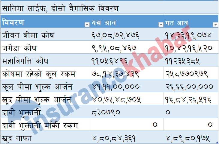 दोस्रो त्रैमासमा सानिमा लाईफले गर्यो प्रगति, ७८ करोड कोषमा, ४१ करोड बीमा शुल्क आर्जन