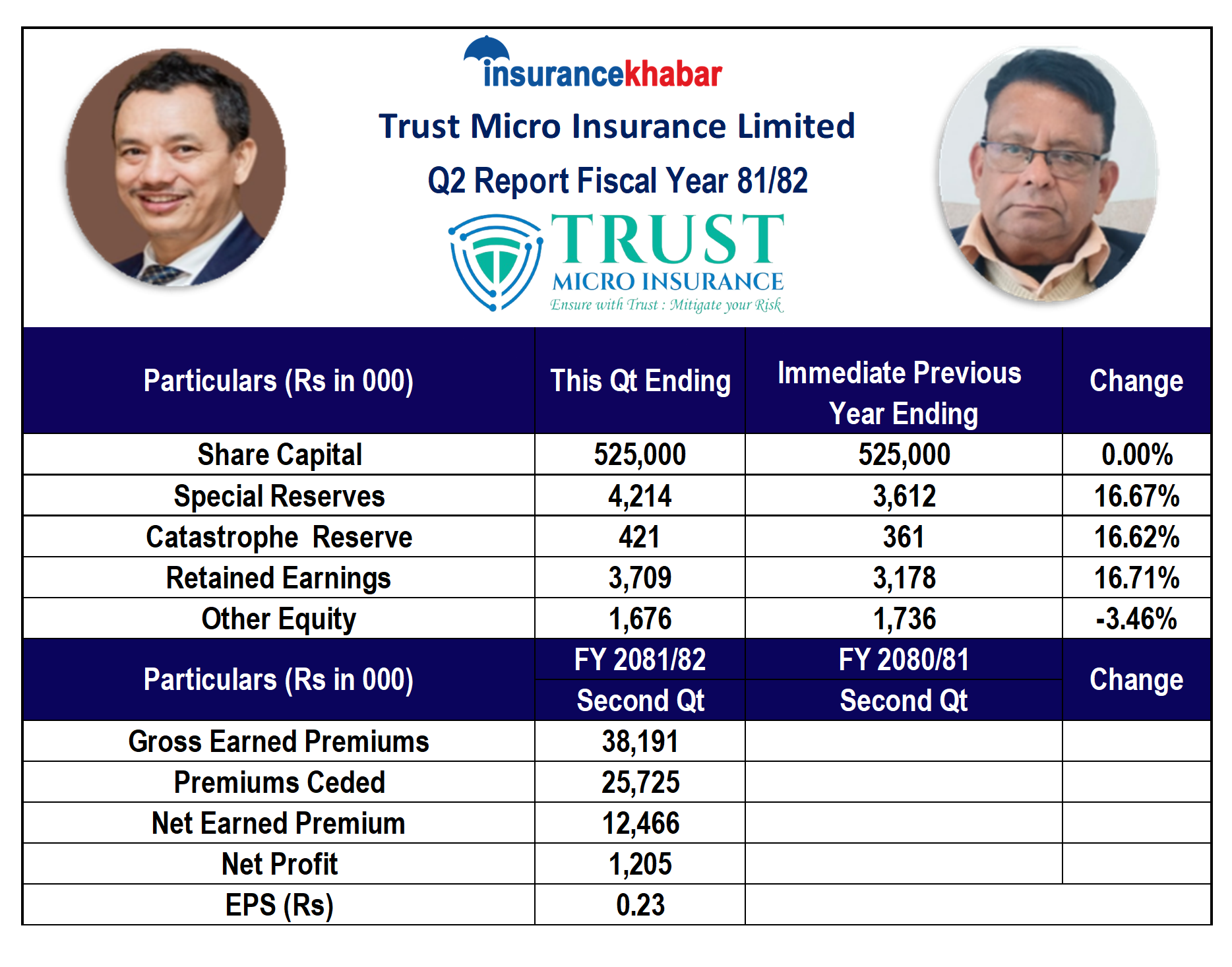 काठमाडौं । ट्रस्ट माइक्रो इन्स्योरेन्सले चालु आर्थिक वर्षको दोस्रो त्रैमास (साउन–पुस)सम्मको अपरिष्कृत वित्तीय विवरण सार्वजनिक गरेको छ।