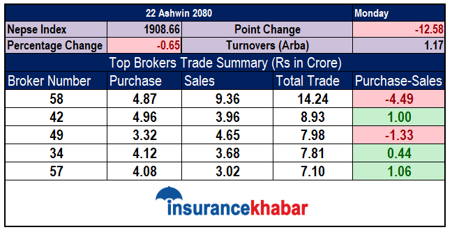 आजको कारोबारलाई हेर्दा शिर्ष ५ ब्रोकरको कारोबार मिश्रित रहेको छ । शिर्ष ५ ब्रोकरमध्ये तीन ब्रोकरले खरीद धेरै गरेका छन् भने बाँकी दुईले विक्री धेरै गरेका छन्  ।