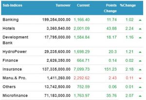 आज कारोबारमा आएका उत्पादन तथा प्रशोधन बाहेकका सबै समूह बढेका छन् । जसमध्ये बीमा समूह सबैभन्दा बढी १५१ दशमलव २३ अंकले बढेको छ । त्यस्तै होटल समूह ४३ दशमलव ८८ अंकले बढेको छ । त्यस्तै लघुवित्त समूह ३५ दशमलव ७६ अंकले, जलविद्युत समूह २० दशमलव ३ अंकले, विकास बैंक समूह १८ दशमलव १७ अंकले, बैंकिङ समूह ११ दशमलव ७४ अंकले, फाइनान्स समूह शुन्य दशमलव १४ अंकले र अन्य समूह शुन्य दशमलव ०६ अंकले बढेका छन् ।