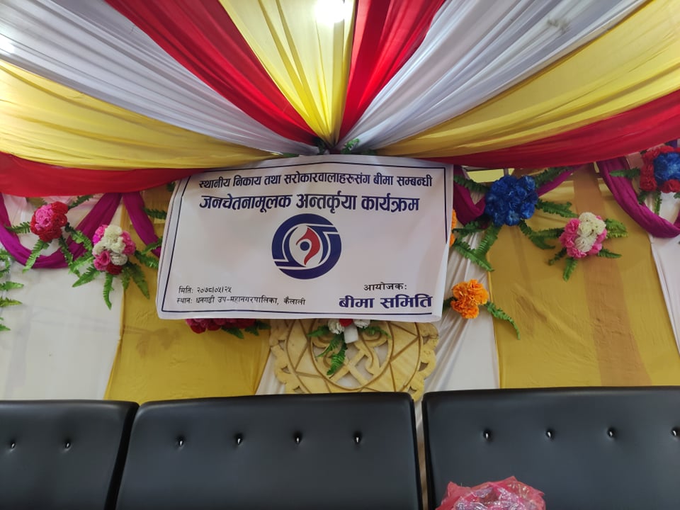 बीमा समितिले आज धनगढी उप महानगरपालिकामा स्थानीय निकाय तथा सरोकारवालाहरु सँग बीमा सम्बन्धी जनचेतनामुलक अन्तर्क्रया कार्यक्रम सम्पन्न गरेको छ । कार्यक्रममा बीमा समितिका कार्यकारी निर्देशक राजुरमण पौडेल, नेपाल बीमक संघका सचिव तथा सगरमाथा इन्स्योरेन्स कम्पनीका प्रमुख कार्यकारी अधिकृत चंकी क्षेत्री, गुराँस लाइफ इन्स्योरेन्स कम्पनीका प्रमुख कार्यकारी अधिकृत नारायण कुमार भट्टराई, बीमा समितिका उप निर्देशक विरोध भट्ट, सहायक निर्देशक निश्चलराज बानिया, सहायक प्रथम अनुराग पाण्डेको सहभागिता थियो । त्यस्तै उपमहानगर प्रमुख नृप वड, उपमेयर, वडा अध्यक्षहरु, जनप्रतिनिधिहरु, बैंक बीमा कम्पनीका शाखा प्रमुखहरु, उद्योगी, व्यापारी, शिक्षक, कृषक लगायतको उपस्थिती थियो ।