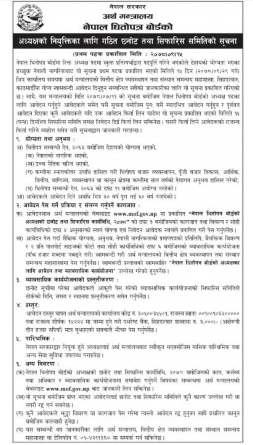 अध्यक्ष बन्न इच्छुक नेपालीले आफ्नो योग्यता पुग्ने कागजपत्रका साथै व्यवसायिक कार्ययोजना समेत पेश गर्नु पर्नेछ । धितोपत्र बोर्डको अध्यक्षका लागि बजार व्यवस्थापन, पूँजी बजार विकास, आर्थिक, वित्तीय, बाणिज्य व्यवस्थापन वा कानुन क्षेत्रमा सात वर्ष काम गरेको अनुभव हुनु पर्ने छ । दरखास्त आवेदन सँगै तीन हजार रुपैयाँ दरखास्त दस्तुर तिर्नु पर्नेछ ।