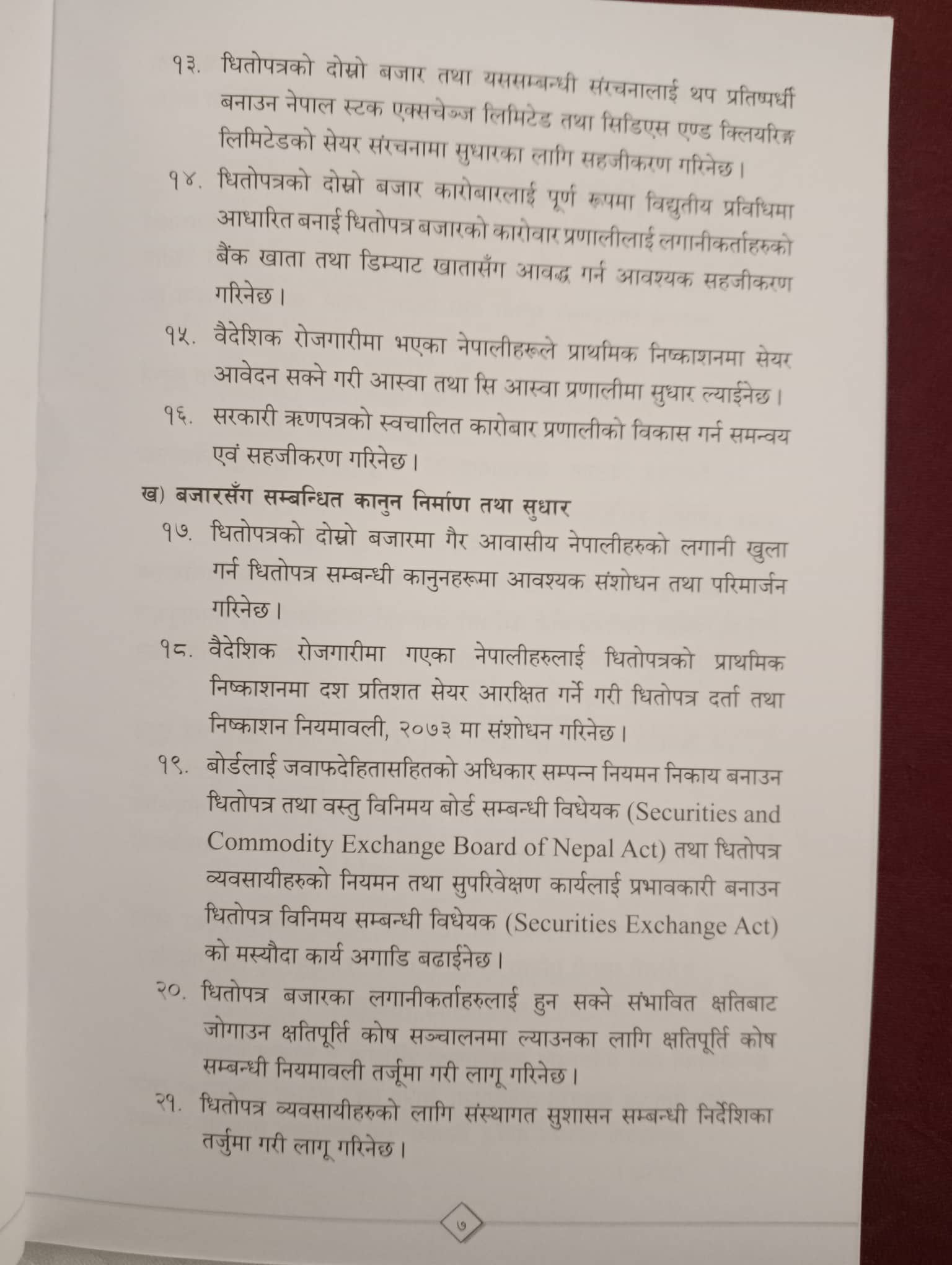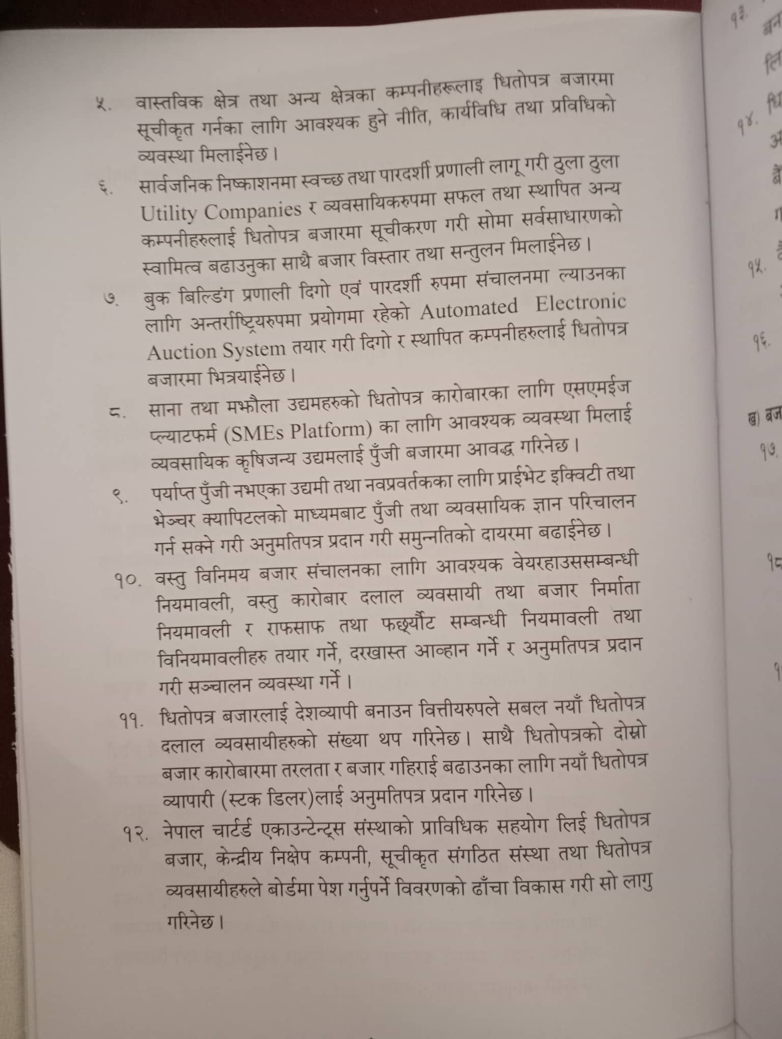 8. साना तथा मझौला उद्यमहरुको धितोपत्र कारोबारका लागि एसएमईज प्ल्याटफर्मका लागि आवश्यक व्यवस्था मिलाई व्यवसायिक कृषिजन्य उद्यमलाई पूँजी बजारमा आवद्ध गरिनेछ ।