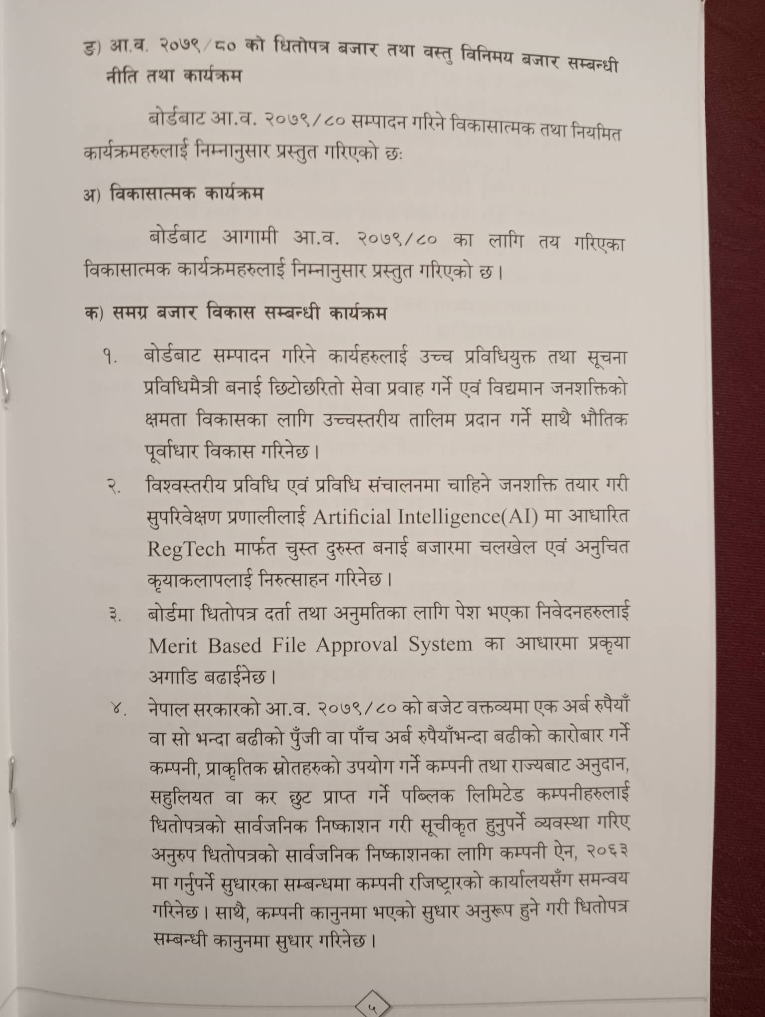 4. नेपाल सरकारको आर्थिक वर्ष २०७९/८० को बजेट वक्तव्यमा एक अर्ब रुपैयाँ वा सो भन्दा बढीको पूँजी वा पाँच अर्व रुपैयाँभन्दा बढीको कारोबार गर्ने कम्पनी, प्राकृतिक स्रोतहरुको उपयोग गर्ने कम्पनी तथा राज्यबाट अनुदान, सहुलियत वा कर छुट प्राप्त गर्ने पब्लिक कम्पनीहरुलाई धितोपत्रको सार्वजनिक निष्काशन गरी सूचिकृत हुनुपर्ने व्यवस्था गरिए अनुरुप धितोपत्रको सार्वजनिक निष्काशन गरी सूचिकृत हुनुपर्ने व्यवस्था गरिए अनुरुप धितोपत्रको सार्वजनिक निष्काशनका लागि कम्पनी ऐन २०६३ मा गर्नुपर्ने सुधारका सम्बन्धमा कम्पनी रजिष्ट्रारको कार्यालयसँग समन्वय गरिनेछ । साथै कम्पनी कानुनमा भएको सुधार अनुरुप हुने गरी धितोपत्र सम्बन्धी कानुनमा सुधार गरिनेछ ।