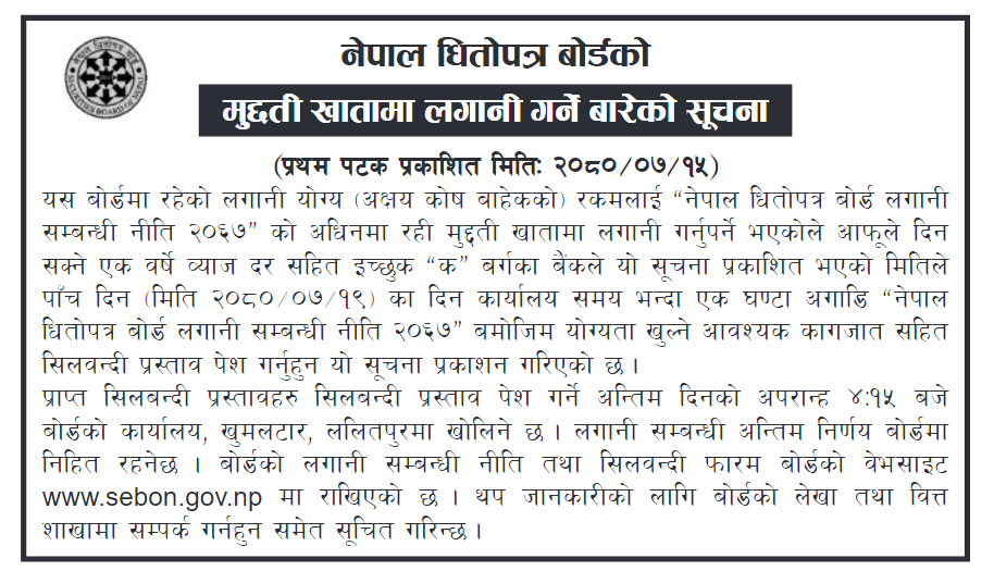 उक्त रकम वाणिज्य बैंकमा मुद्दति निक्षेपका रुपमा १ वर्षका लागि लगानी गरिने सेबोनले जनाएको छ । ईच्छुक बैंकले कात्तिक १९ गते कार्यालय समयभन्दा १ घन्टा अगाडि योग्यता खुल्ने आवश्यक कागजातसहित शिलबन्दी प्रस्ताव गर्न बोर्डले आग्रह गरेको छ ।