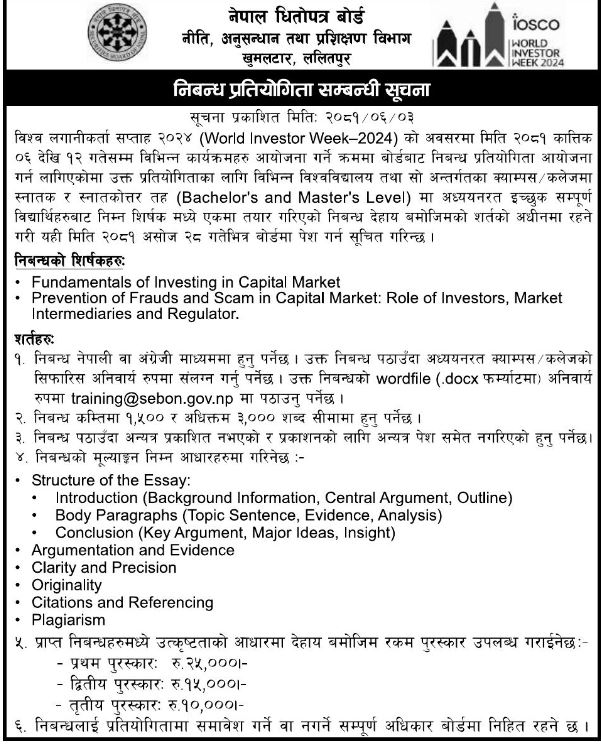 उक्त प्रतियोगिताका लागि विभिन्न विश्वविद्यालय तथा सो अन्तर्गतका क्याम्पस र कलेजमा स्नातक र स्नातकोत्तर तहमा अध्ययनरत इच्छुक विद्यार्थीहरुले ‘फन्डामेन्टल इन्भेष्टिङ इन क्यापिटल मार्केट’ र ‘प्रिभेन्सन अफ फ्रड स्क्याम इन क्यापिटल मार्केट रोलअफ इन्भेष्टर्स,मार्केट इन्टरमेरियडिज एन्ड रेगुलेटर’ शिर्षकमा निवन्ध लेख्नुपर्ने जनाइएको छ ।