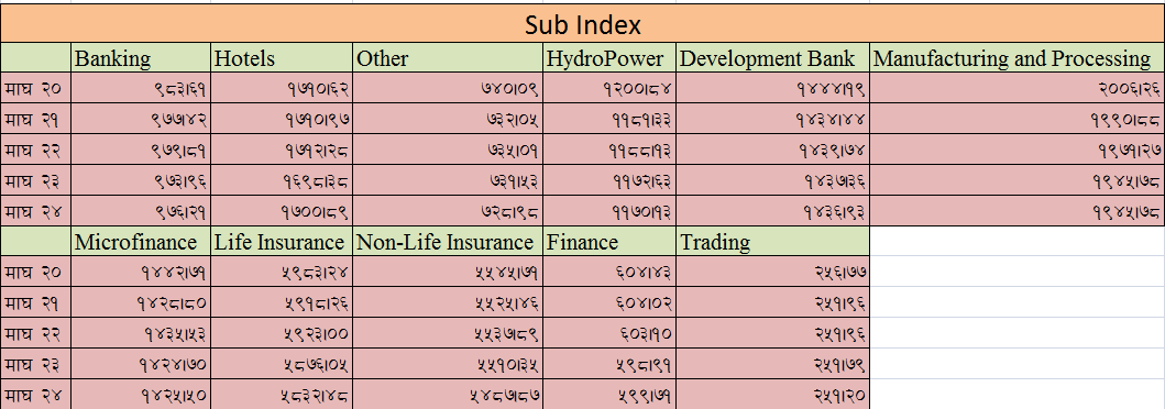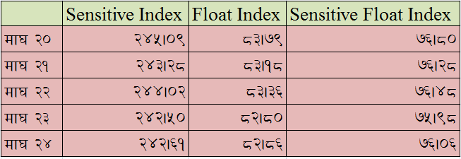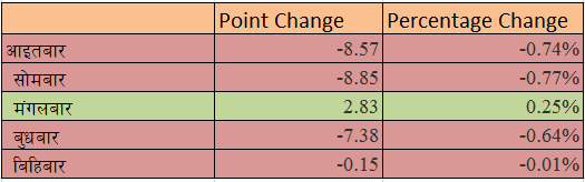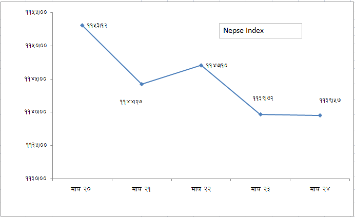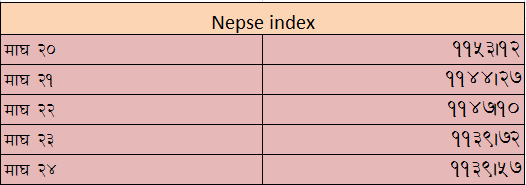 यो साता ५ दिन मध्ये ४ कारोवार दिन नेप्से परिसूचक घटेको थियो भने एक कारोवार दिन मात्र नेप्से परिसूचक सामान्य अंकले वृद्धि भएको थियो ।