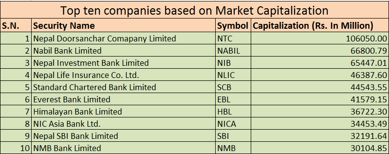 आजको मिति सम्म सबै भन्दा ठुलो बजार पुँजीकरण भएको कम्पनीमा नेपाल टेलिकम परेको छ । दोश्रोमा नबिल बैंक लिमिटेढ, तेश्रोमा नेपाल इन्भेस्टमेन्ट बैंक रहेको छ भने नेपाल लाईफ इन्स्योरेन्स चौथोमा पर्दछ ।