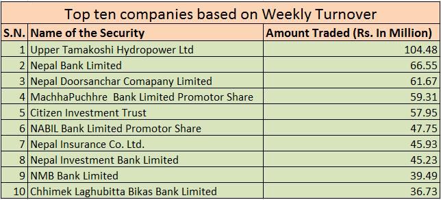 अघिल्लो साता जस्तै यो साता पनि सबै भन्दा धेरै माथिल्लो तामाकोशीको शेयर किन बेच भएको छ भने दोश्रोमा नेपाल बैंक लिमिटेडको शेयर किन बेच भएको छ ।