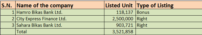 यो साता हाम्रो विकास बैंकको बोनस शेयर र सिटि एक्सप्रेस फाईनान्स र सहारा विकास बैंकको हकप्रद शेयर गरेर ३५ लाख २१ हजार ८ सय ५८ कित्ता शेयर सुचिकृत भएको छ ।
