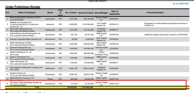 काठमाडौं । धौलागिरी लघुवित्त वित्तीय संस्था लिमिटेडले आईपीओ निष्काशनका लागि नेपाल धितोपत्र बोर्ड (सेबोन) मा निवेदन दिएको छ । कम्पनीले ३ करोड ३१ लाख बराबरको ३ लाख ३१ हजार कित्ता आईपीओ निष्काशनको लागि बोर्डमा निवेदन दिएको हो । कम्पनीले आइपीओ विक्रीका लागि बोर्डमा फागुन २३ गते निवेदन दिएको हो ।
