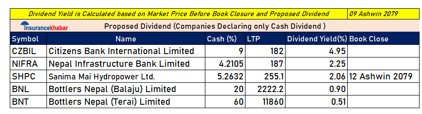 असोज ९ गतेको बजार मूल्यको आधारमा नगद लाभांश मात्र प्रस्ताव गरेका ५ कम्पनी मध्ये सिटिजन्स बैंकको “डिभिडेण्ड इल्ड” सबै भन्दा धेरै छ। सिटिजन्स बैंकले ९ प्रतिशत नगद लाभांश प्रस्ताव गरेको छ भने कम्पनीको बजार मूल्य १८२ रुपैयाँ छ । पछिल्लो बजार मूल्यको आधारमा बैंकको “डिभिडेण्ड इल्ड” ४ दशमलव ९५ प्रतिशत छ ।