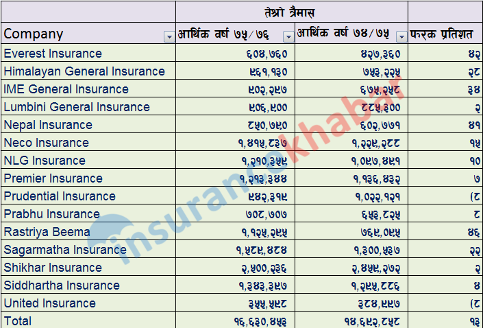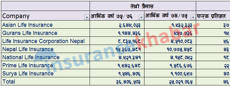 आर्थिक वर्ष ७५/७६ को तेश्रो त्रैमास र आर्थिक वर्ष ७४ /७५को तेश्रो त्रैमासलाई दाँजेर हेर्दा निर्जीवन बीमा व्यवसाय भन्दा जीवन बीमा व्यसाय नै फैलिएको देखिन्छ।