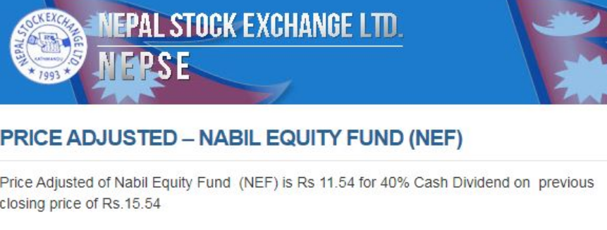 समायोजन पछि नबिल इक्विटी फण्डको इकाई मूल्य ११.५४ पैसा कायम भएको छ । फण्डको अन्तिम कारोबार मूल्य १५.५४ पैसाको आधारमा मूल्य समायोजन गरिएको नेप्सेले जनाएको छ ।
