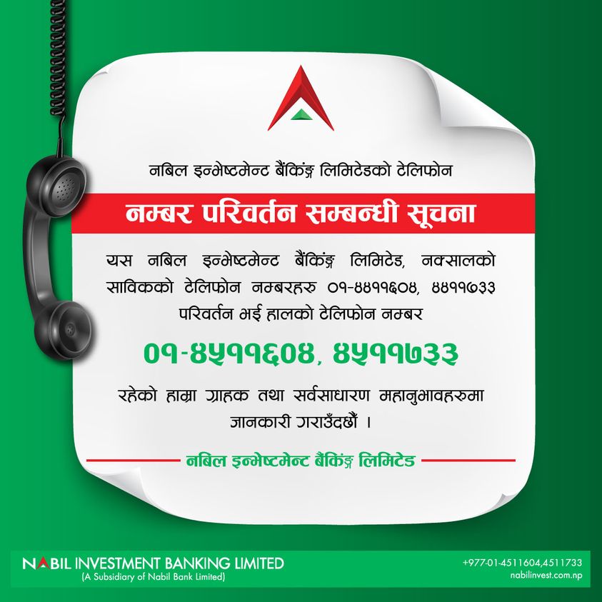 काठमाडौं । नबिल इन्भेष्टमेन्ट बैंकिङ्ग लिमिटेडको कार्यालयको सम्पर्क नम्बर परिवर्तन भएको छ । इन्भेष्टमेन्ट बैंकिङ्गले एक सुचना जारी गर्दै नक्साल कार्यालयको सम्पर्क नम्बर परिवर्तन गरेको जनाएको छ । साविकको टेलिफोन नम्बरहरु परिवर्तन भएको बताएको छ ।