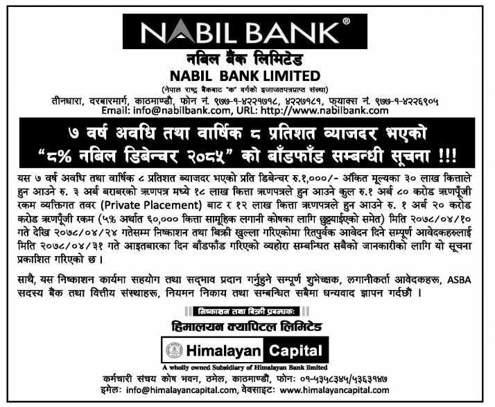 काठमाडौँ । नबिल बैंक लिमिटेडको ऋणपत्र बाँडफाँड भएको छ । बैंकले साउन १० गते आईतबारबाट साउन २४ गते, आईतबारसम्म निष्काशन गरेको ऋणपत्र बाँडफाँड गगरेको जनाएको छ ।