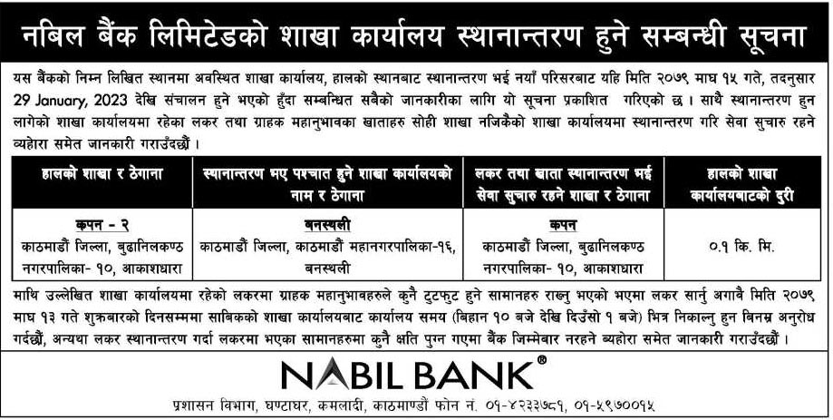 काठमाडौं । नबिल बैंक लिमिटेडको शाखा कार्यालय स्थानान्तरण भएको छ । बैंकको एक सुचना जारी गर्दै कपन शाखा कार्यालय स्थानान्तरण गरेको जनाएको छ ।