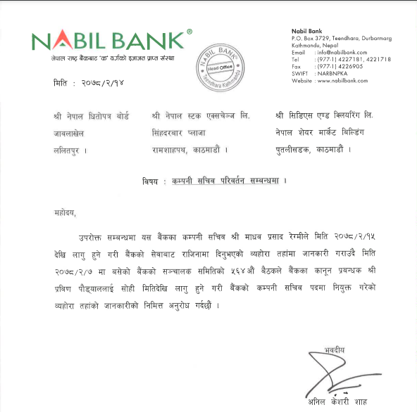 यस अघिका सचिव माधव प्रसाद रेग्मीले जेठ १५ गतेदेखि लागू हुने गरी राजिनामा दिएकाले सोही मितिदेखि बैंकले लागू हुने गरी पौड्याललाई कम्पनी सचिवमा नियुक्त गरेको जनाएको छ ।