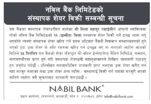 काठमाडौं । नबिल बैंकले संस्थापक शेयर विक्री गर्ने भएको छ । कम्पनीले २६ कित्ता संस्थापक शेयर विक्री गर्न लागेको जनाएको छ ।