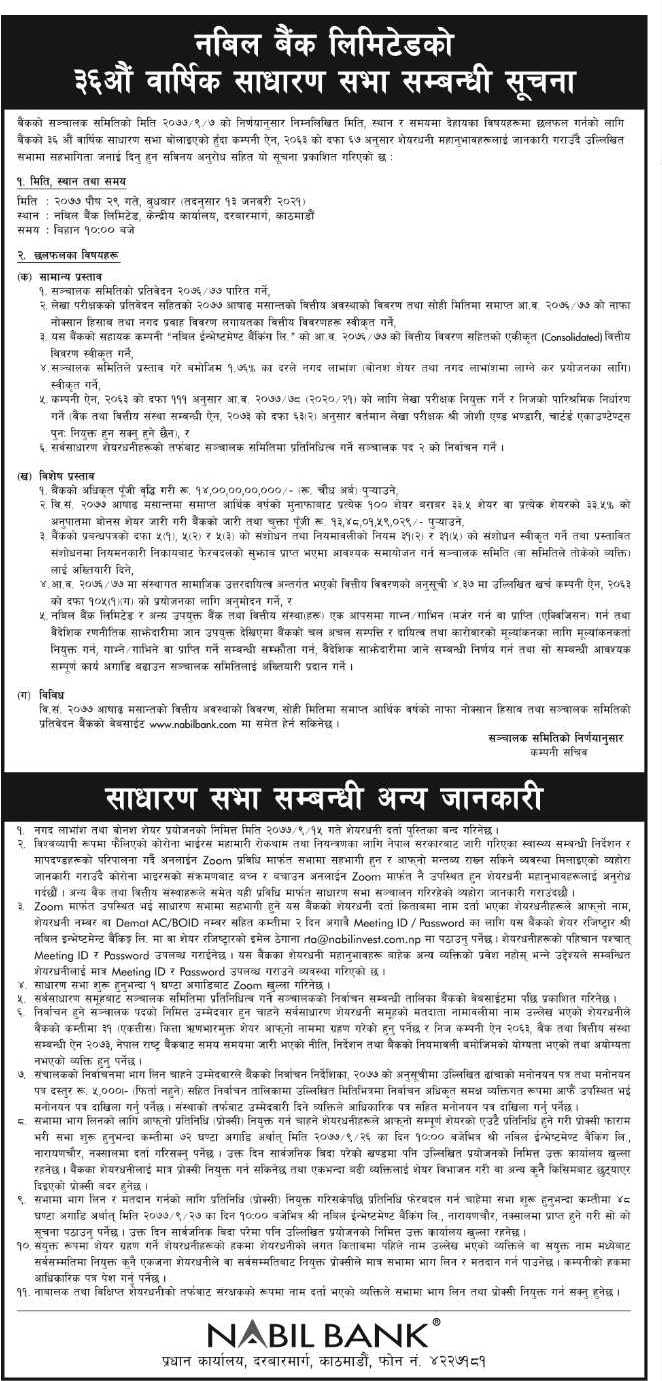 नबिल बैंकको साधारण सभा पुस २९ गते, बुक क्लोज कहिले ?