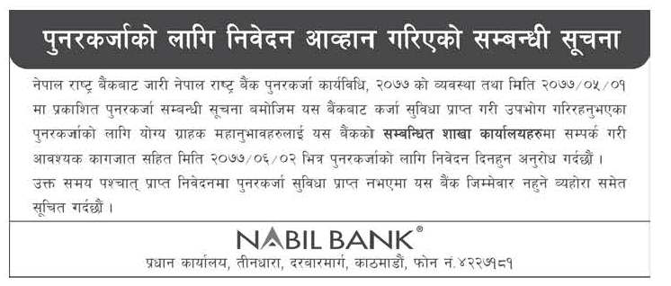 काठमाडौं । नबिल बैंक लिमिटेडले आफ्ना ग्राहक तथा ऋणीहरुलाई पुनरकर्जाको लागि आवेदन दिन आग्रह गरेको छ ।
