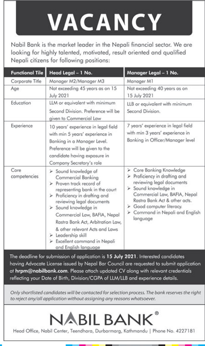 काठमाडौं । नबिल बैंकले कर्मचारीको माग गरेको छ । बैंकले हेड लिगलमा म्यानेजर एम२,म्यानजेर एम३ र म्यानेजर लिगलमा कर्मचारीको माग गरेको हो । बैंकले ४० वर्ष ननाघेका व्यक्तिलाई आवेदन दिन भनेको छ ।