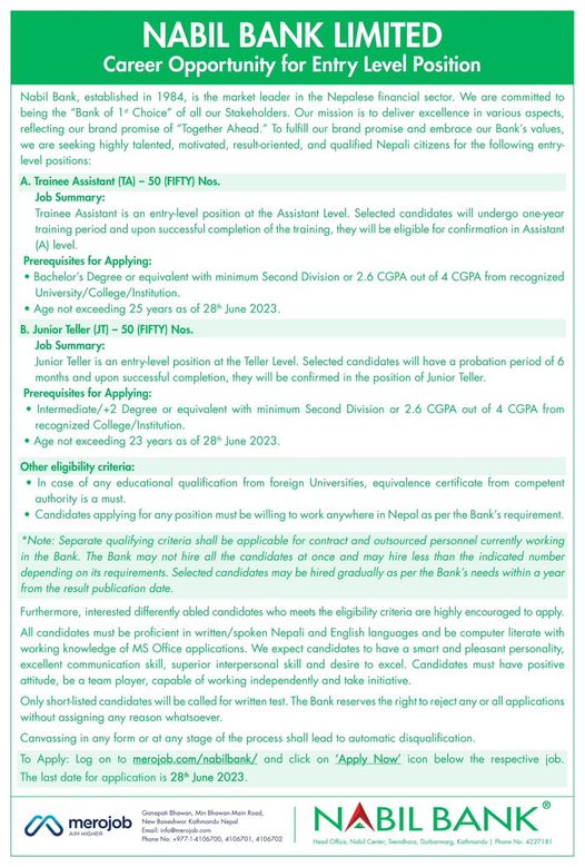 काठमाडौं । नबिल बैंक लिमिटेडले कर्मचारी माग गरेको छ । बैंकले ट्रेनी असिस्टेन्टका लागि र जुनियर टेलर पदका लागि कर्मचारी माग गरेको हो ।उक्त पदहरुमा आवेदन दिनको लागि प्लस टु देखि स्नातक तह उत्तिर्ण गरेको हुनुपर्ने छ । अनुभवि, क्षमतावान , नेतृत्व गर्न सक्ने क्षमता भएका उम्मेदवारलाई प्राथमिकता दिइने बैंकले जनाएको छ । ईच्छुक तथा योग्यता पुगेकाले असार १३ गतेभित्र आवेदन दिन सक्नेछन् ।