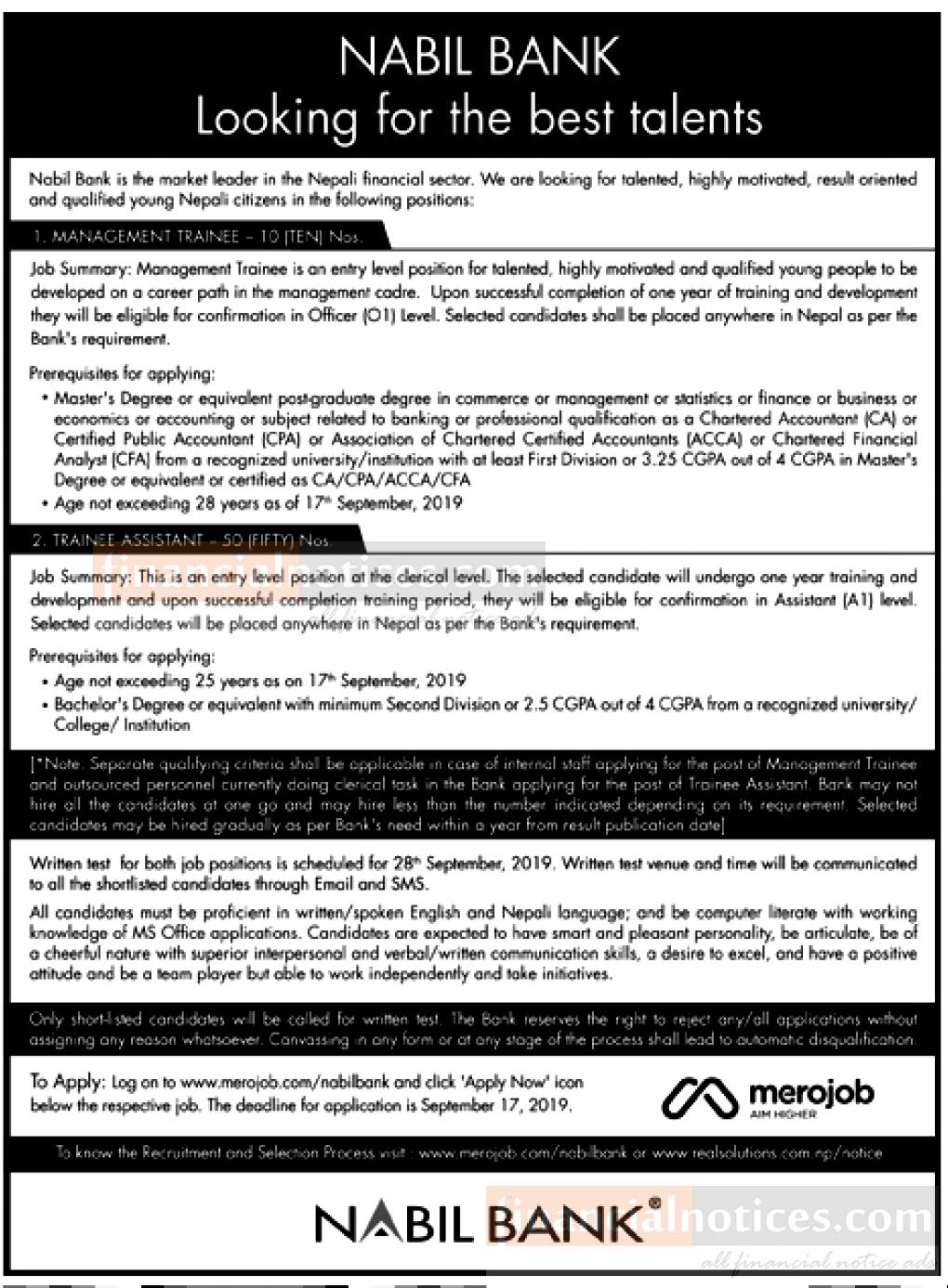 काठमाडौँ । नबिल बैंकले विभिन्न पदका लागि कर्मचारी माग गरेको छ । बैंकले म्यानेजमेन्ट ट्रेनी १० जना र ट्रेनी असिस्टेन्ट ५० जना गरी ६० जना कर्मचारी माग गरेको हो ।