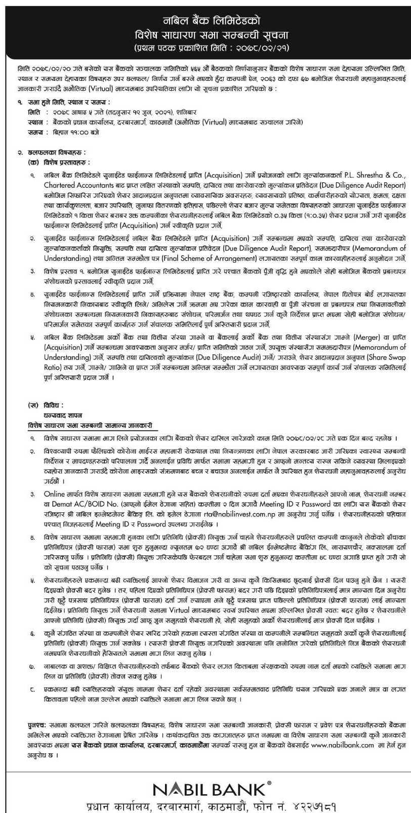 विशेष साधारण सभाले युनाइटेड फाइनान्सलाई नबिल बैंकले १०० बराबर ३५ को शेयर स्वाप रेसियोमा प्राप्त गर्ने विशेष प्रस्ताव पारित गर्नेछ । युनाइटेडलाई प्राप्ति गरेपश्चात नबिलको पुँजी वृद्धि हुने भएकोले सोहीबमोजिम बैंकको प्रबन्धपत्र संशोधनको प्रस्तावलाई सभाले स्वीकृति प्रदान गर्नेछ।