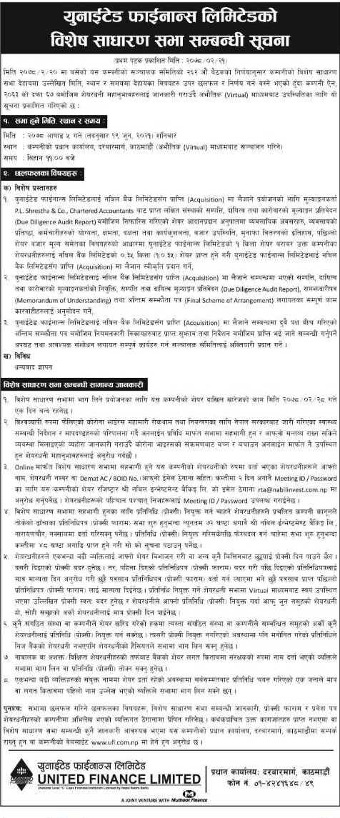 काठमाडौं । नबिल बैंक लिमिटेडले युनाइटेड फाइनान्स लिमिटेडलाई प्राप्ति गर्ने भएको छ । प्राप्ति सम्बन्धि प्रस्ताव पारित गर्न दुवै कम्पनीले एकैदिन असार ५ गते विशेष सभा बोलाएका छन् । दुवै कम्पनीको विशेष साधारण सभा आआफ्नो केन्द्रीय कार्यालयमा भर्चुअल माध्यमबाट बिहान ११ बजेदेखि शुरु हुने जनाएको छ ।