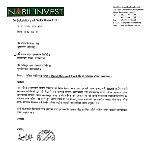 नबिल ब्यालेन्सड फण्ड २ ले कर सहित ३५ प्रतिशतले हुन आउने ३९ करोड २० लाख बराबरको नगद लाभांश वितरण गर्ने भएको छ ।