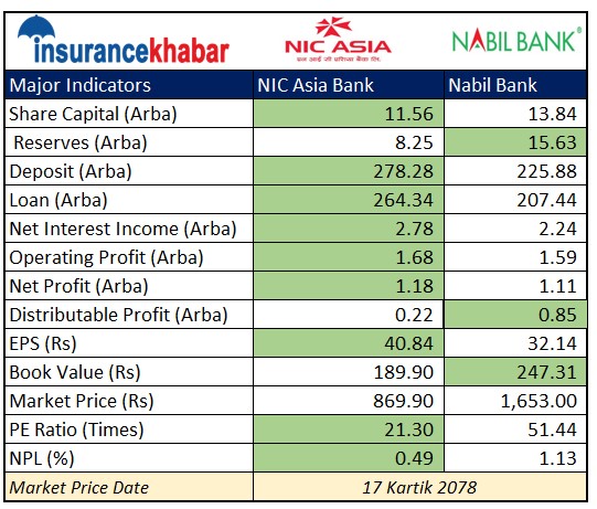काठमाडौं । नबिल बैंक र एनआईसी एशिया बैंक एक नम्बर बन्न टक्कर दिदै आएका बैंक हुन्। केही समय यता एनआईसी एशिया बैंक आक्रामक रुपमा व्यापार गर्दै सबै वाणिज्य बैंकलाई टक्कर दिदै आएको छ। दुवै बैंकले आर्थिक वर्ष ७८/७९ प्रथम त्रैमासको वित्तीय विवरण सार्वजनिक गरेको अवस्थामा दुई बैंक बीच इन्स्योरेन्स खबरले आर्थिक वर्ष ७८/७९ को प्रथम त्रैमासको आधारमा गरेको तुलनात्मक अध्ययन: