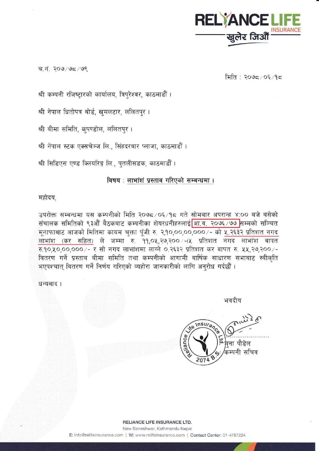 असोज १८ गते सोमबार अपरान्ह ४ बजे बसेको संचालक समितिको ९३ औ बैठकले आर्थिक वर्ष २०७६/७७ सम्मको सञ्चित मुनाफाबाट उक्त लाभांश दिने निर्णय गरेको हो । कम्पनीको हालको चुक्ता पूँजी २ अर्ब १० करोड रुपैयाँ रहेको छ । प्रस्ताविक लाभांश बीमा समितिबाट स्वीकृत भए पनि आगामी वार्षिक साधारणसभामा पेश गरिनेछ । साधारणसभाले उक्त लाभांश पारित भए पछि मात्रै शेयरधनीहरुले प्राप्त गर्न सक्ने छन् ।
