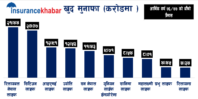 सबै भन्दा थोरै खुद मुनाफा गर्नेमा रिलायन्स लाईफ रहेको छ। रिलायन्स लाईफले ४ करोड ३४ लाख मात्र खुद मुनाफा गरेको छ।