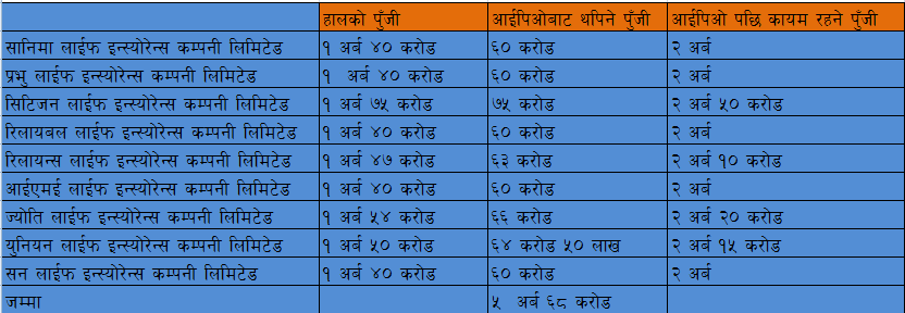 बीमा समितिले जीवन बीमा कम्पनीहरूलाई २ अर्ब पुँजी पुर्याउन भने पनि कुनै पनि नयाँ जीवन बीमा कम्पनीहरूको पुँजी २ अर्ब पुगेको छैन। उनीहरू आइपिओ मार्फत जनतालाई शेयर दिएर २ अर्ब पुँजीको लक्ष्य हासिल गर्ने योजनामा छन्। बिमा समितिको निर्देशन अनुसार जारी पुंजीको कम्तिमा ३० प्रतिशत शेयर सर्बसाधारणलाई बिक्रि गर्नु पर्छ।