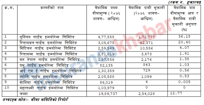 तथ्याङकमा उल्लेखित दाबी भुक्तानी यूनियन लाईफ बाहेक अन्य नौ वटा कम्पनीको हकमा सबै नै मृत्यु दाबी भुक्तानी रकम नै हो। संचालन अवधिको छोटो समयको ३ महिनामा बढी भन्दा बढी मृत्यु दाबी भुक्तानी हुनु भनेको कम्पनीको अण्डरराईटिङ नीति फितलो रहेको तथा अभिकर्ताबाट जथाभावि व्यवसाय संकलन भएको मानिन्छ अर्को तर्फ बढी मृत्यु दाबी भुक्तानीले कम्पनीको जीवन बीमा कोषमा असर पारी समग्रमा वित्तीय अवस्थालाई कमजोर बनाउँछ।दाबी भुक्तानीमा सबैभन्दा बढि भुक्तानी गर्ने यूनियन लाईफको ३६।१८% रहेको छ।