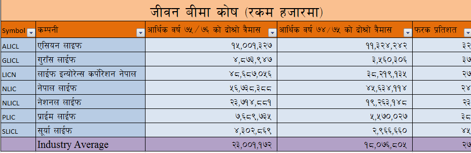 जीवन बीमा कम्पनीको प्रमुख सूचांक मध्यको एक जीवन बीमा कोष हो र पुराना ७ जीवन बीमा कम्पनीको जीवन बीमा कोष औसतमा २७ प्रतिशतले वृद्धि भएको छ । सूर्या लाईफ इन्स्योरेन्सले आफ्नो जीवन बीमा कोष सबै भन्दा धेरै ४५ प्रतिशतले वृद्धि गर्न सफल भएको छ ।