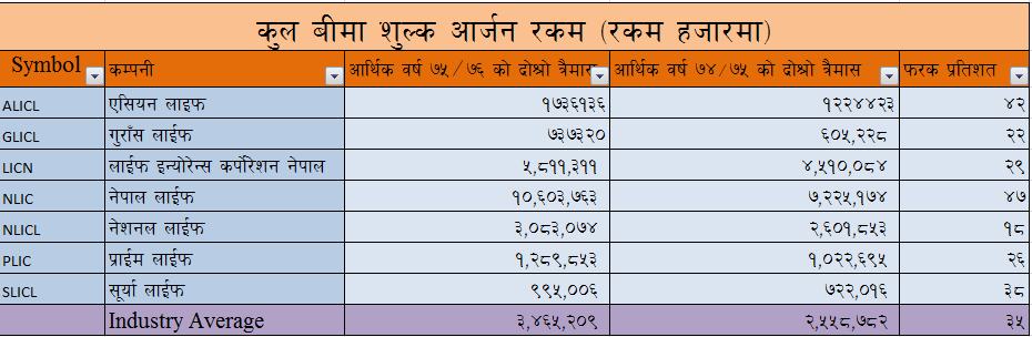 नेपाल लाईफ इन्स्योरेन्सले आफ्नो बीमा शुल्क आर्जन रकम सबै भन्दा धेरै ४७ प्रतिशतले वृद्धि गर्न सफल भएको छ ।