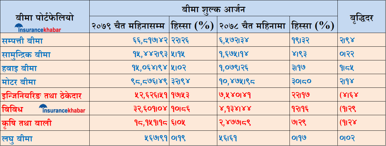 विविध बीमा तर्फको व्यवसायले १२.१६ प्रतिशत हिस्सा ओगटेकोमा यस वर्ष १०.६८ प्रतिशत मात्रै छ । त्यस्तै हवाइ बीमा तर्फको हिस्सामा पनि सामान्य बृद्धि देखिएको छ । सामुद्रिक बीमाको बजार हिस्सा पनि ४.९३ प्रतिशतबाट ५.१५ प्रतिशत पुगेको छ । आयात बढ्दा यस तर्फको बीमा शुल्क आर्जनमा बृद्धि देखिएको हो । कृषि तथा बाली बीमाको पोर्टफेलियोमा भने गिरावट देखिन्छ । यस्तो पोर्टफेलियो ७.२९ प्रतिशतबाट ६.०५ प्रतिशतमा खुम्चिएको छ । लघु बीमामा भने सामान्य सुधार देखिन्छ ।
