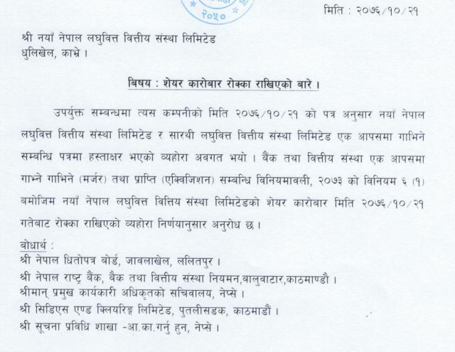 काठमाडौं । नयाँ नेपाल लघुवित्त वित्तीय संस्थाको शेयर कारोबार रोक्का भएको छ । सारथी लघुवित्तसँग मर्जरमा जाने सम्झौता गरेपछि आज मंगबलबारदेखि नयाँ नेपाल लघुवित्तको शेयर कारोबार रोक्का भएको हो ।
