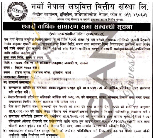 काठमाडौं । नयाँ नेपाल लघुवित्तको साधारण सभा पुस १९ गते हुने भएको छ । कम्पनीको मंसिर २३ गते बसेको संचालक समिसतिको बैठकले एघारौ साधारण सभाको मिति तय गरेको हो । सभा होटल जुगाल धुलिखेल काभ्रेमा हुने संस्थाले जनाएको छ ।
