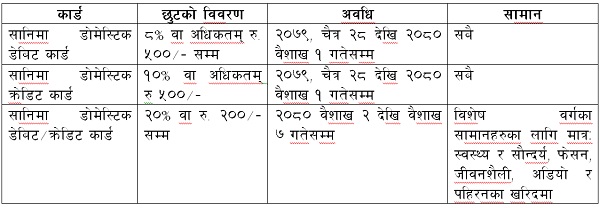 उक्त सहकार्य बमोजिम दराजको अनलाइन प्ल्याटफर्मबाट सानिमा बैंक डोमेस्टिक डेबिट । क्रेडिट कार्ड मार्फत अग्रीम भुक्तानी गरी सामान खरिद गर्दा निम्न अनुसारको छुट पाउने व्यवस्था गरिएको छ ।