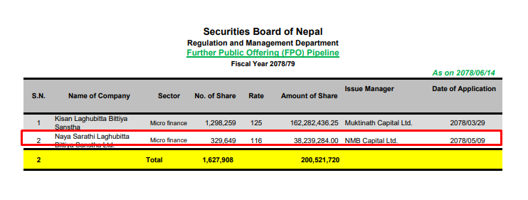 काठमाडौं । नयाँ सारथी लघुवित्त वित्तीय संस्थाले एफपीओ निष्काशन गर्ने भएको छ । संस्थाले प्रति शेयर ११६ रुपैयाँको दरले ३ लाख २९ हजार ६४९ कित्ता एफपीओ निष्काशन गर्नका लागि बोर्डमा निवेदन दिएको हो ।