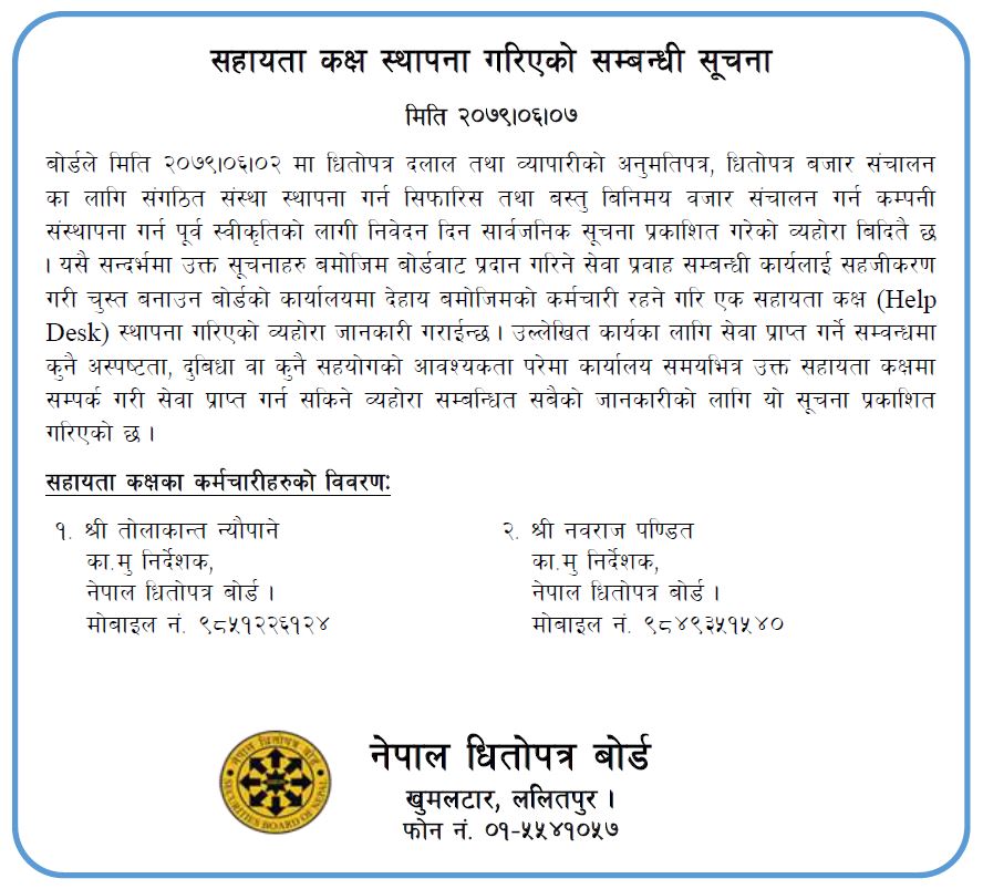 बोर्डबाट प्रदान गरिने सेवा प्रवाहसम्बन्धी कार्यलाई सहजीकरण गरी चुस्त बनाउन दुई कायममुकायम निर्देशकलाई सहायता कक्षको जिम्मेवारी दिइएको जनाएको छ । लाइसेन्सको आवेदन पेश गर्ने सम्बन्धमा कुनै अस्पष्टता, दुविधा भएमा सोका लागि सहयोग आवश्यक भए कार्यालय समयभित्र सहायता कक्षमा सम्पर्क गर्न बोर्डले सहायता कक्ष संचालन गरेको जनाएको छ ।