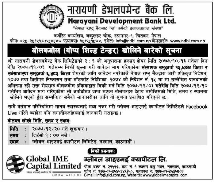 उक्त बोलपत्र निष्काशन तथा बिक्री प्रबन्धक ग्लोबल आइएमई क्यापिटल लिमिटेड, नक्साल, काठमाडौँमा दिउँसो १ बजे खोलिने बैंकले जनाएको छ ।