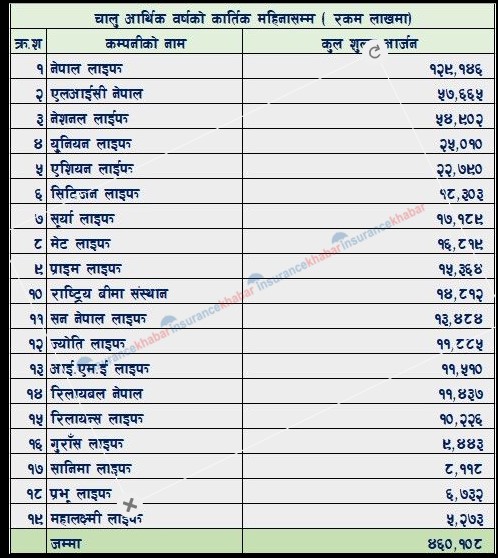 यस अवधिसम्ममा सबैभन्दा धेरै नेपाल लाइफले आर्जन गरेको छ । कम्पनीले कार्तिक महिनासम्ममा १२ अर्ब ५१ करोड रुपैयाँ कुल व्यवसाय गरेको छ । दोस्रोमा एलआइसी नेपाल रहेको छ । कम्पनीले यस अवधिसम्ममा ५ अर्ब ७६ करोड ६५ लाख रुपैयाँ कुल बीमा शुल्क आर्जन गरेको छ । तेस्रोमा नेशनल लाइफ रहेको छ । कम्पनीले यस अवधिसम्ममा ५ अर्ब ४९ करोड रुपैयाँ कुल बीमा शुल्क आर्जन गरेको छ ।