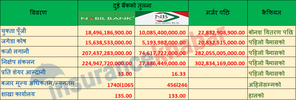 हाल बंगलादेश बैंकको चुक्ता पूँजी १० अर्ब ८ करोड रुपैयाँ रहेको छ । स्वाप रेसियो १०० बराबर ४३ रुपैयाँ हुँदा नविल बैंकमा बंगलादेशको तर्फबाट ४ अर्ब ३३ करोड रुपैयाँ मात्रै जोडिनेछ । नविल बैंकको हालको चुक्ता पूँजी १८ अर्ब ४९ करोड रुपैयाँ रहेको छ । दुबै बैंकको पूँजी अहिले घोषणा गरिएको तथा पारित भएको बोनश शेयर वितरण पश्चातको हो । मर्जर पछि नविल बैंकको चुक्ता पूँजी २२ अर्ब ८३ करोड रुपैयाँ पुग्नेछ ।